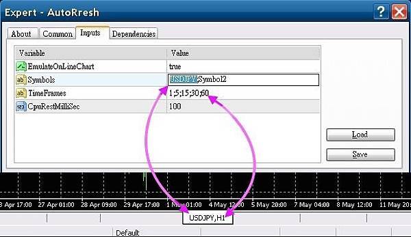 3. 在對話方塊中的Inputs標籤下,依照你開啟的離線圖表名稱,和週期,設定對應參數。